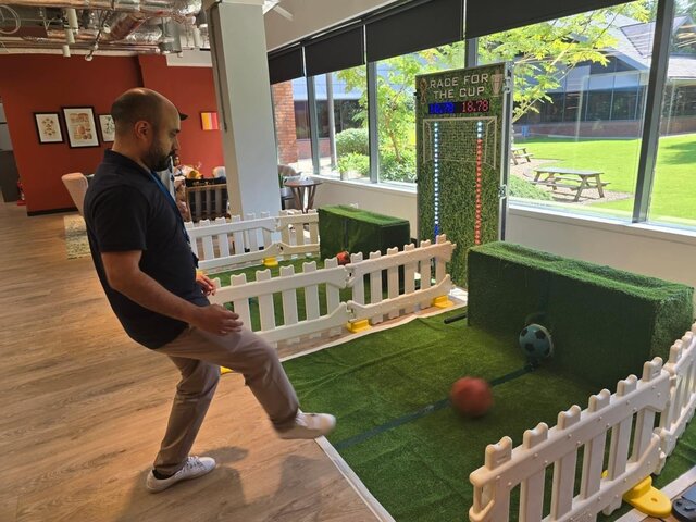 This two-player soccer simulator challenges players to kick their ball at the target to score goals. Each goal is recorded by lighting up a spot on the scoreboard. The winner is the first to light all 30 spots or achieve the best score within 60 seconds.